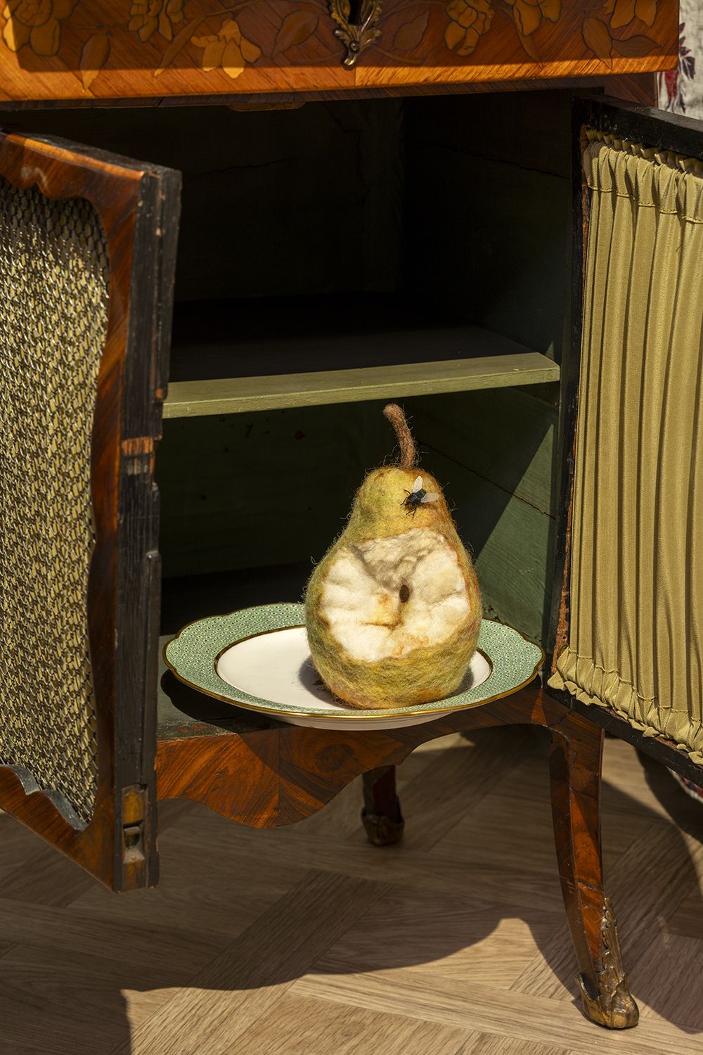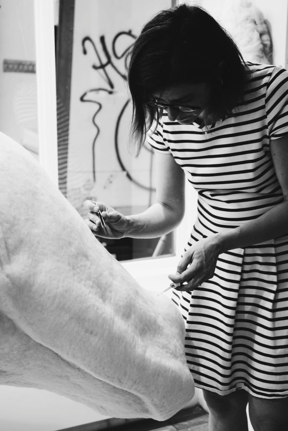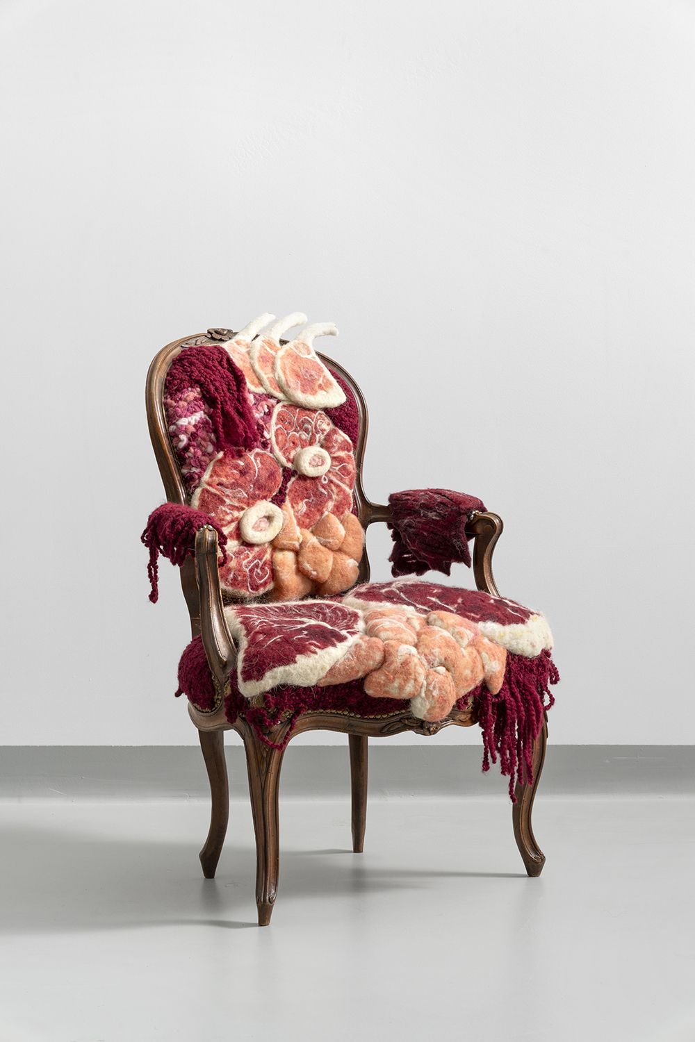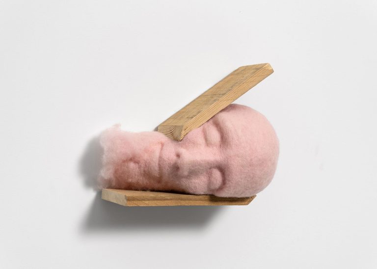 When the pandemic isolated her from the outside world, carded wool emerged as a cathartic outlet. A living, eco-friendly material—the result of human and animal labor—it became the tangible link that still connects her to the world. This fluid medium—evoking femininity and the hearth, ultra-plastic and pictorial—which she transforms through tens of thousands of needle stitches, grants her renewed creative power.