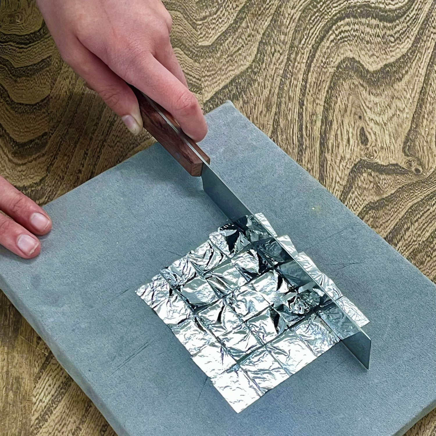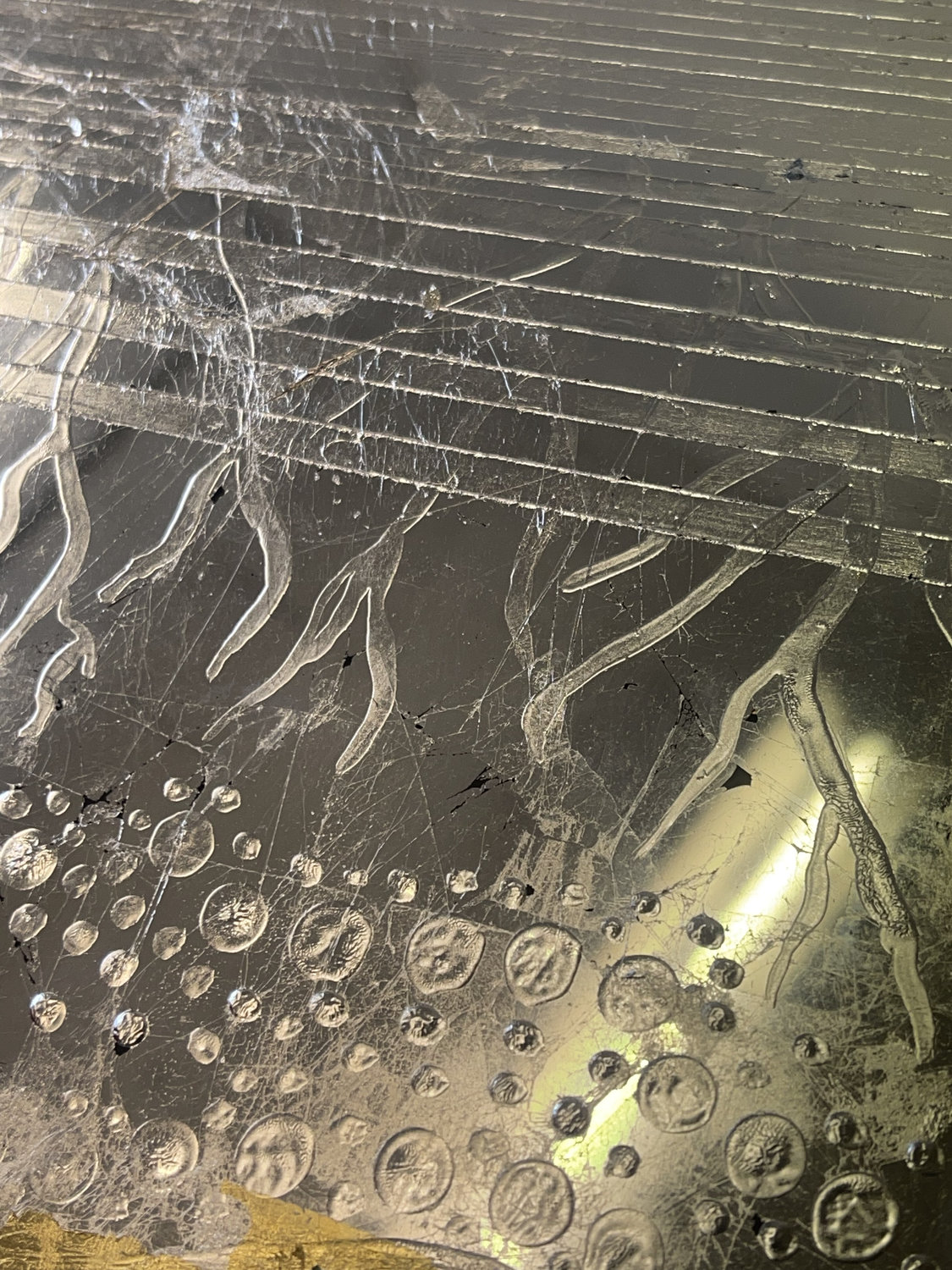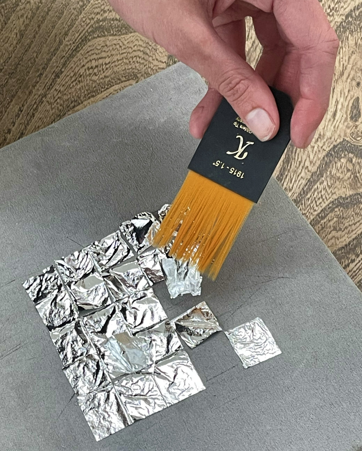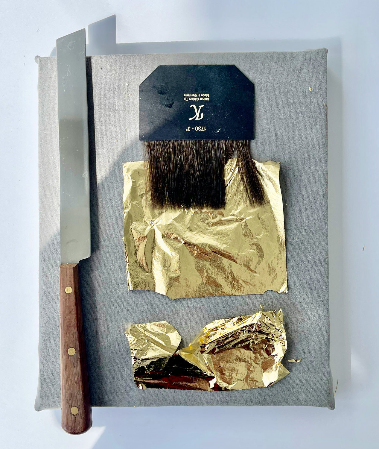 • Work the gilded surface with tools and brushes to create marks, textures, and patterns