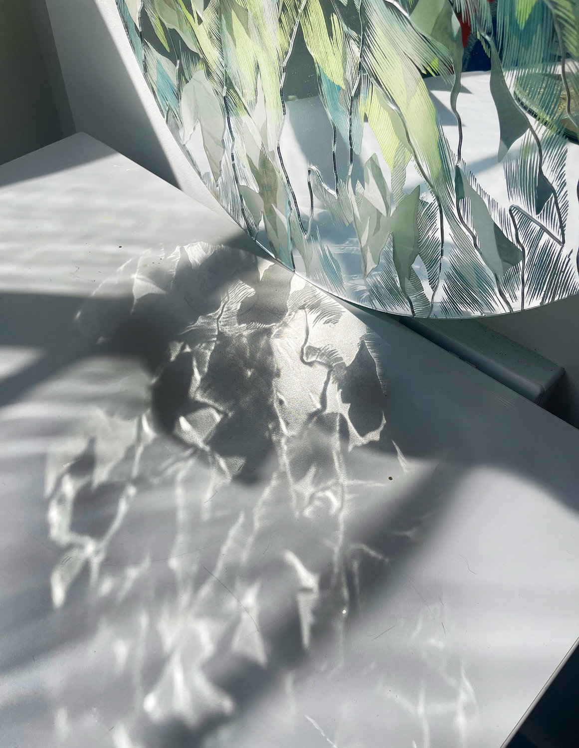 Based in London, British artist Elizabeth Kent creates a universe where glass becomes landscape and light, raw material. By combining glass and reflective metals, she composes mirror-like works of almost alchemical precision, available as unique pieces and limited editions. Her creations, inspired by natural forms, play with reflectivity to produce subtle optical effects that transform space and invite the viewer to a sensory experience of reflection and landscape.