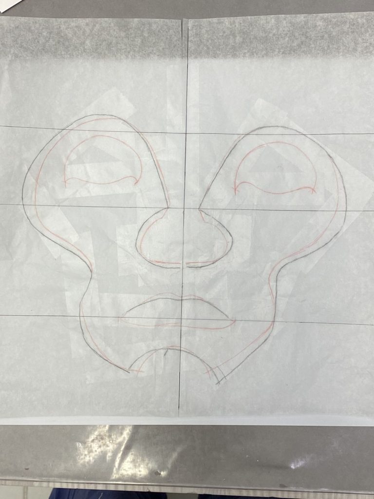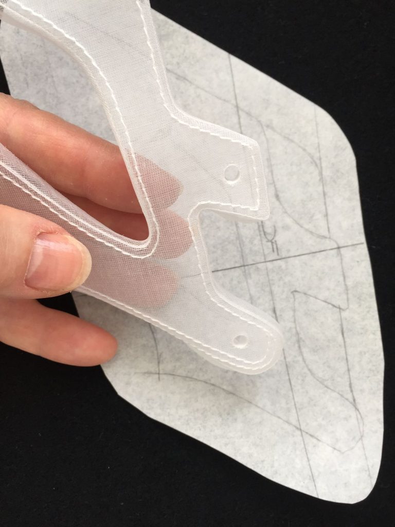 On these supports, sewing lines are marked based on the fabric’s behavior. A pattern is then created to allow for precise cutting of the organdy. Each piece is marked to indicate the sewing lines and the grain of the fabric.