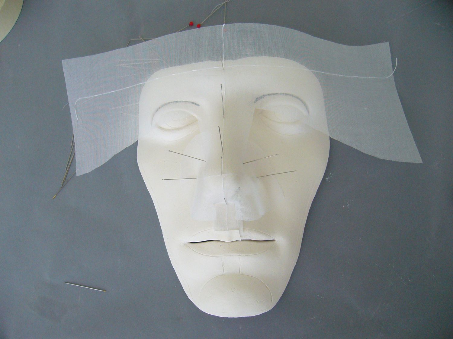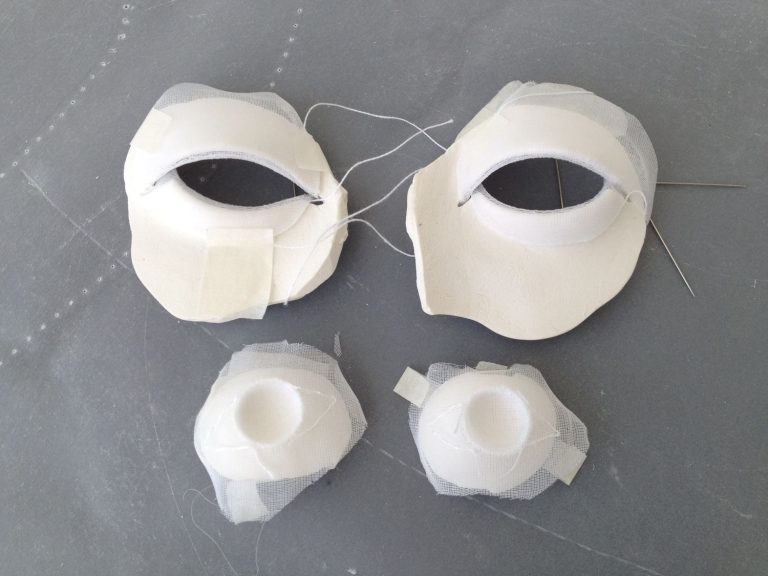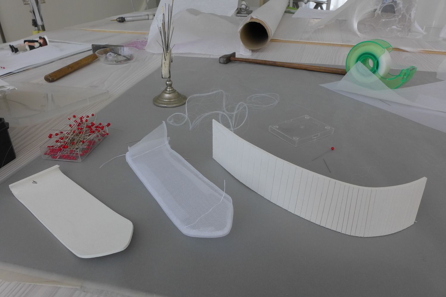 The work relies on the use of plaster forms, which serve as a base for constructing the shapes. The fabric, sometimes dampened, is draped over these forms and then shaped through sewing. Some plaster forms are provided in advance to avoid drying time.