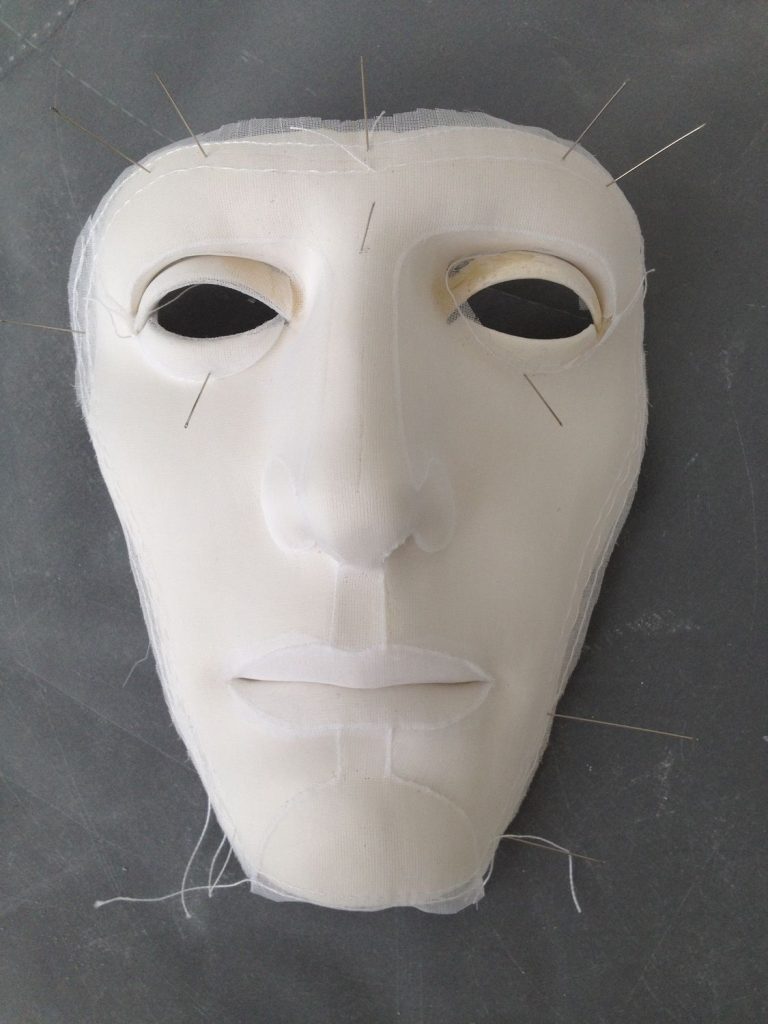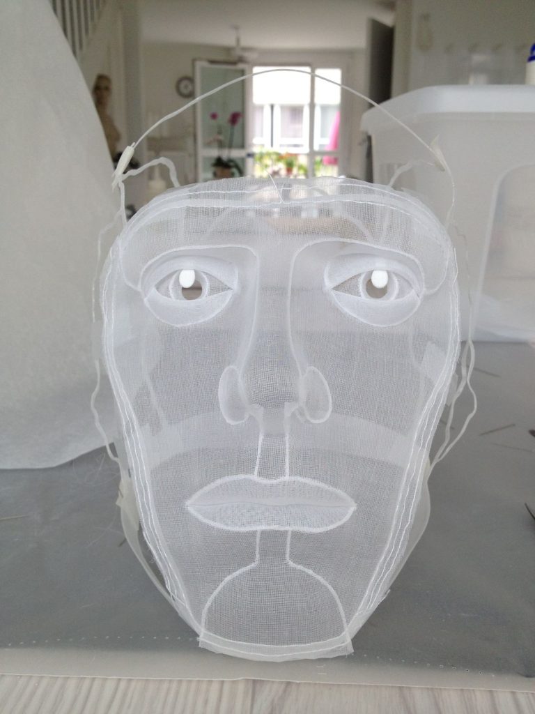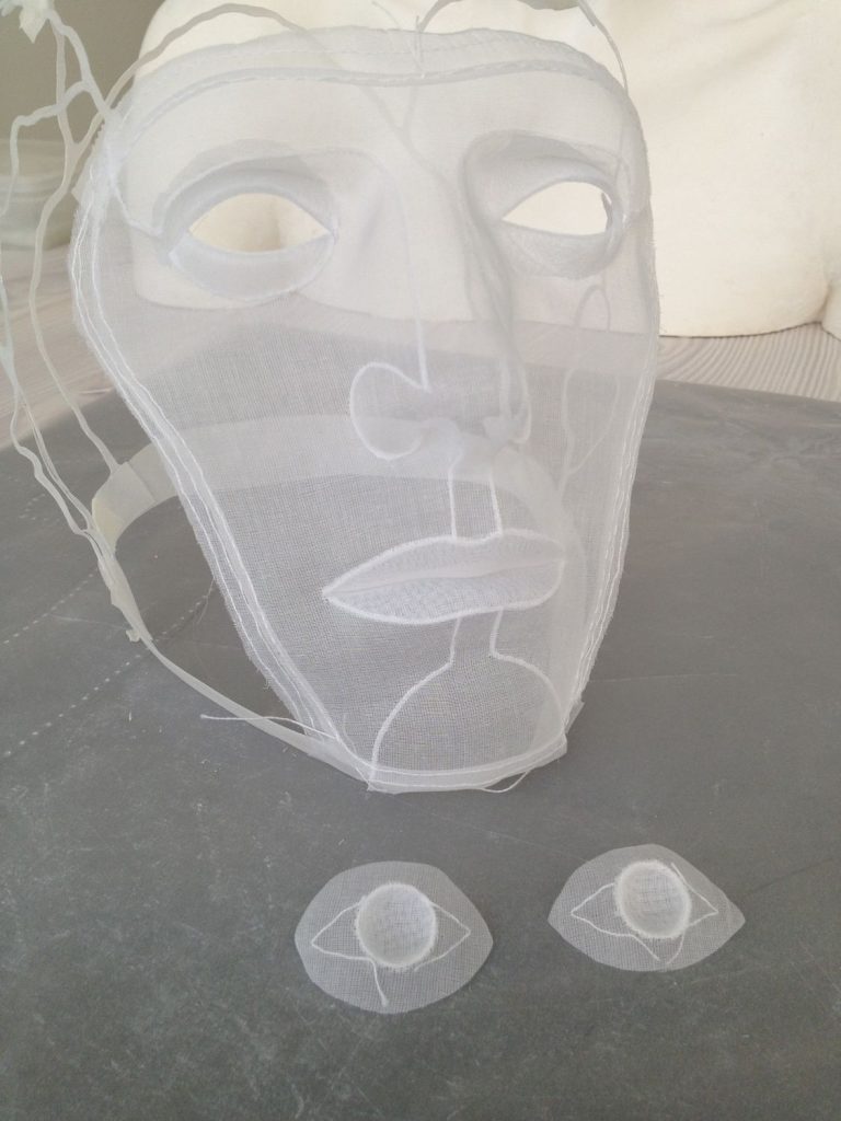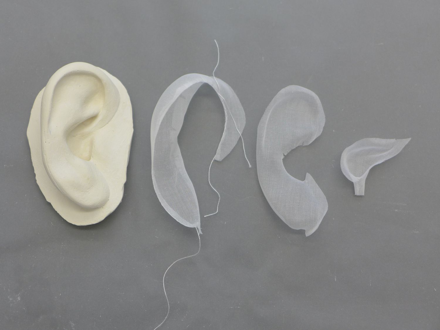 The work relies on the use of plaster forms, which serve as a base for constructing the shapes. The fabric, sometimes dampened, is draped over these forms and then shaped through sewing. Some plaster forms are provided in advance to avoid drying time.