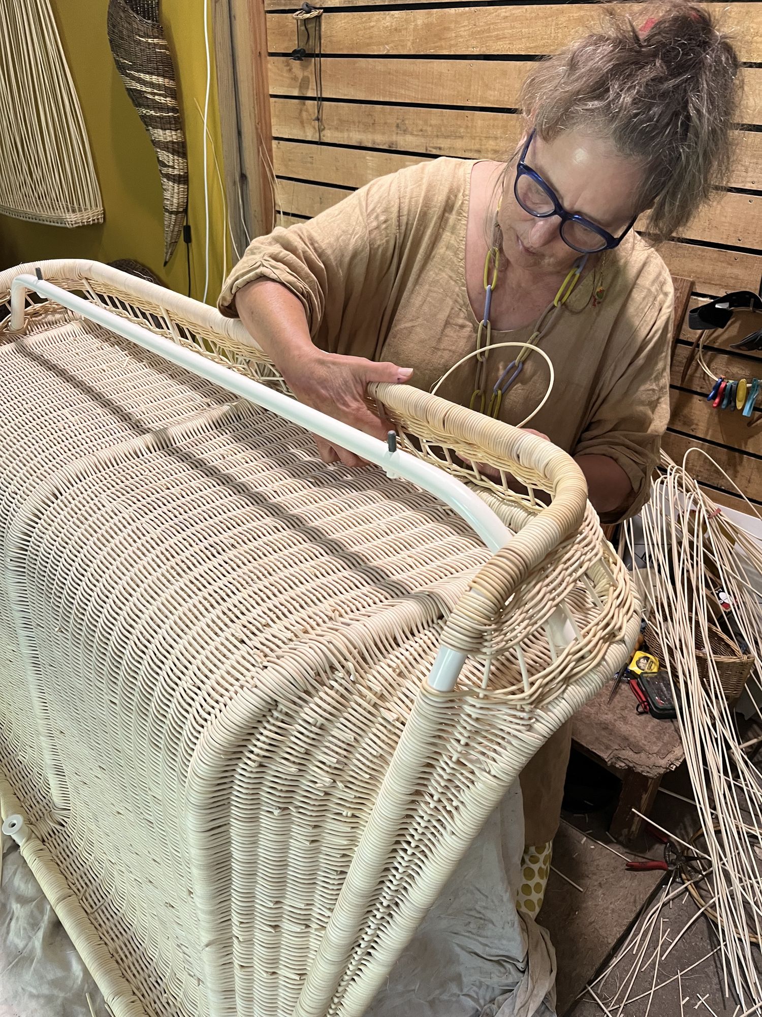 In Villaines-les-Rochers, a mecca of French basketry, Catherine Romand weaves decades of expertise and creative freedom in her expert hands. A 1981 graduate of the National School of Osiericulture and Basketry, she is the first woman to graduate from the rattan furniture industry. For over 40 years, she has been crafting wicker with a rare rigor, blending artisanal tradition and artistic research.