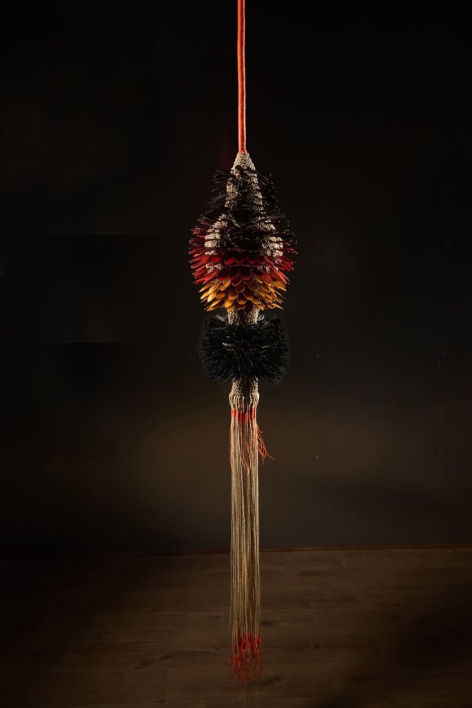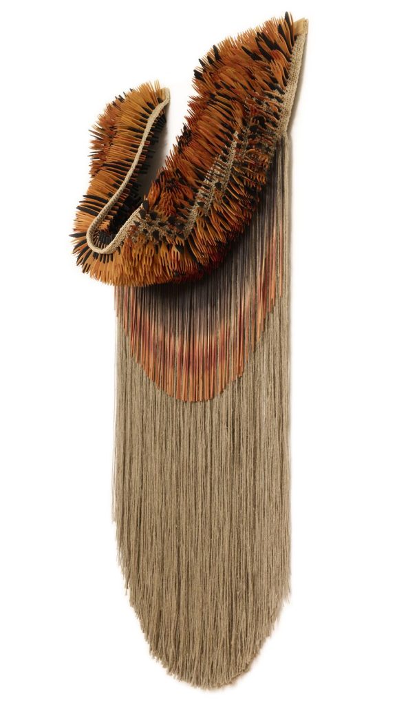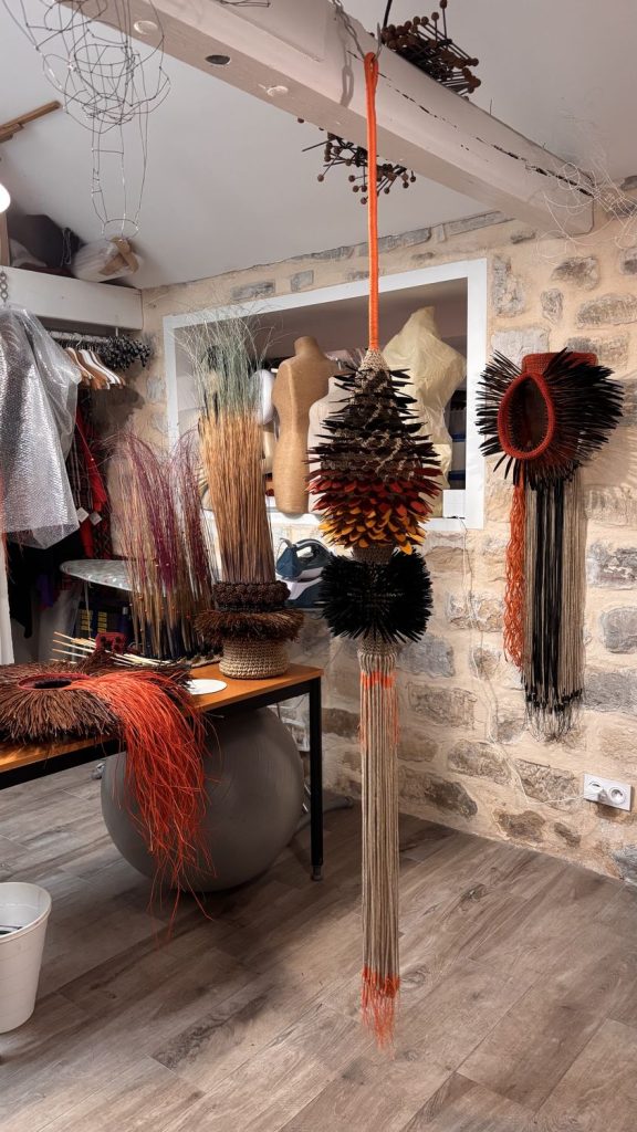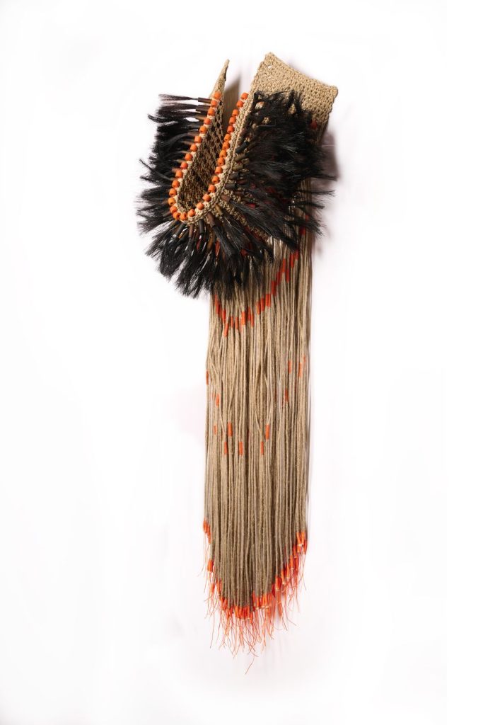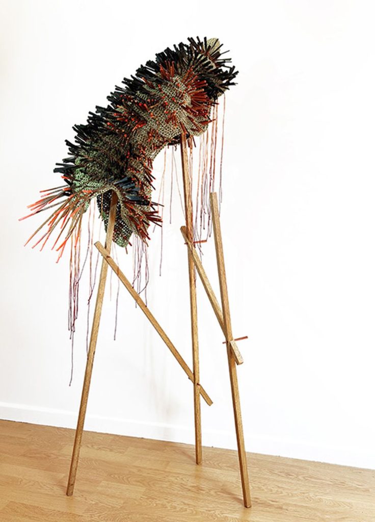 Dans une relation profondément tactile à la matière, l’artiste compose à partir de fibres naturelles, de fils, mais aussi d’objets manufacturés ou glanés dans la nature. Intégrés au cœur du textile, ces éléments donnent naissance à des formes organiques, à mi-chemin entre évocations végétales et présences animales. Le crochet, le nouage et le tissage deviennent alors des outils de construction, capables de générer volumes, tensions et architectures.