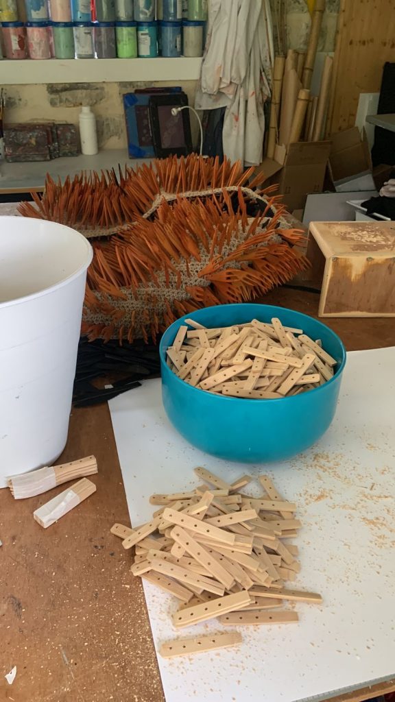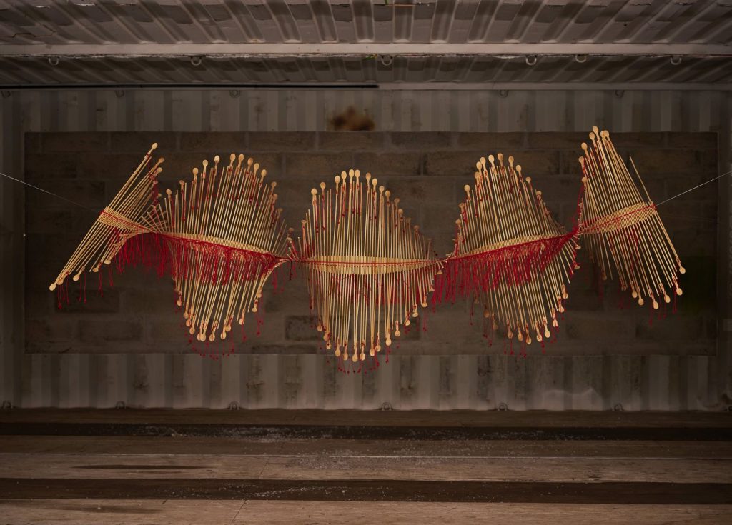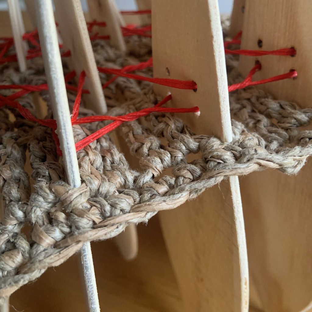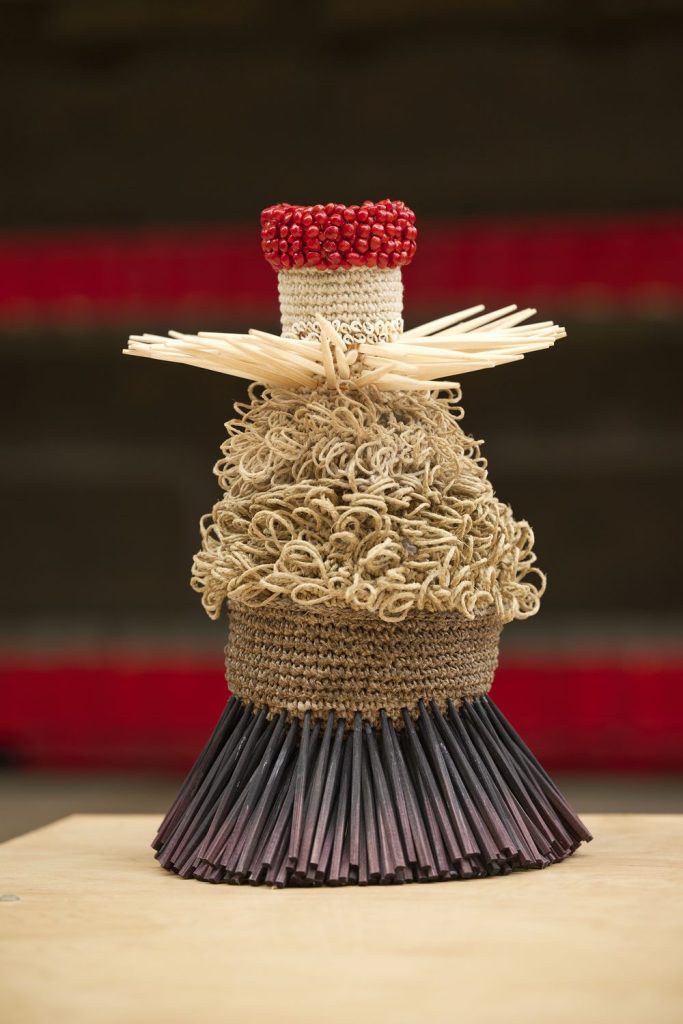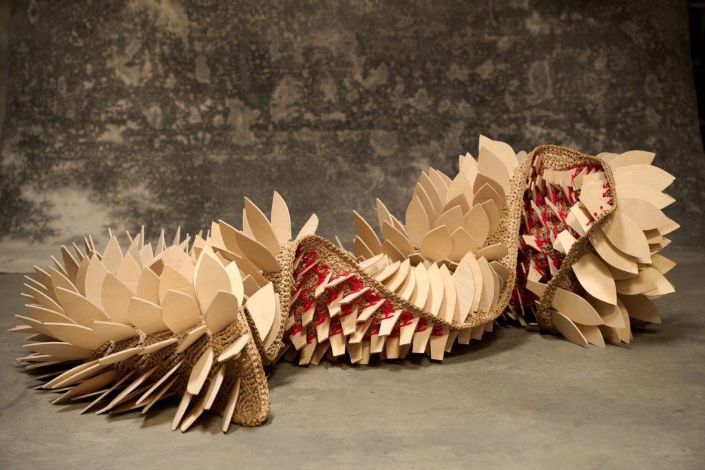 Dans une relation profondément tactile à la matière, l’artiste compose à partir de fibres naturelles, de fils, mais aussi d’objets manufacturés ou glanés dans la nature. Intégrés au cœur du textile, ces éléments donnent naissance à des formes organiques, à mi-chemin entre évocations végétales et présences animales. Le crochet, le nouage et le tissage deviennent alors des outils de construction, capables de générer volumes, tensions et architectures.